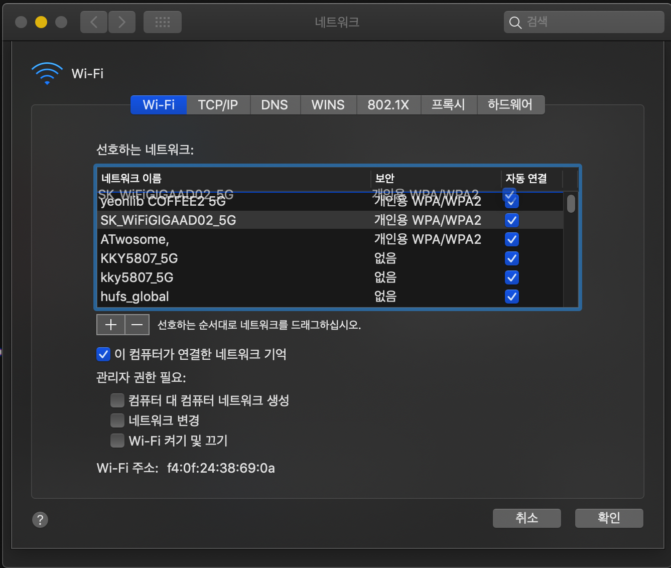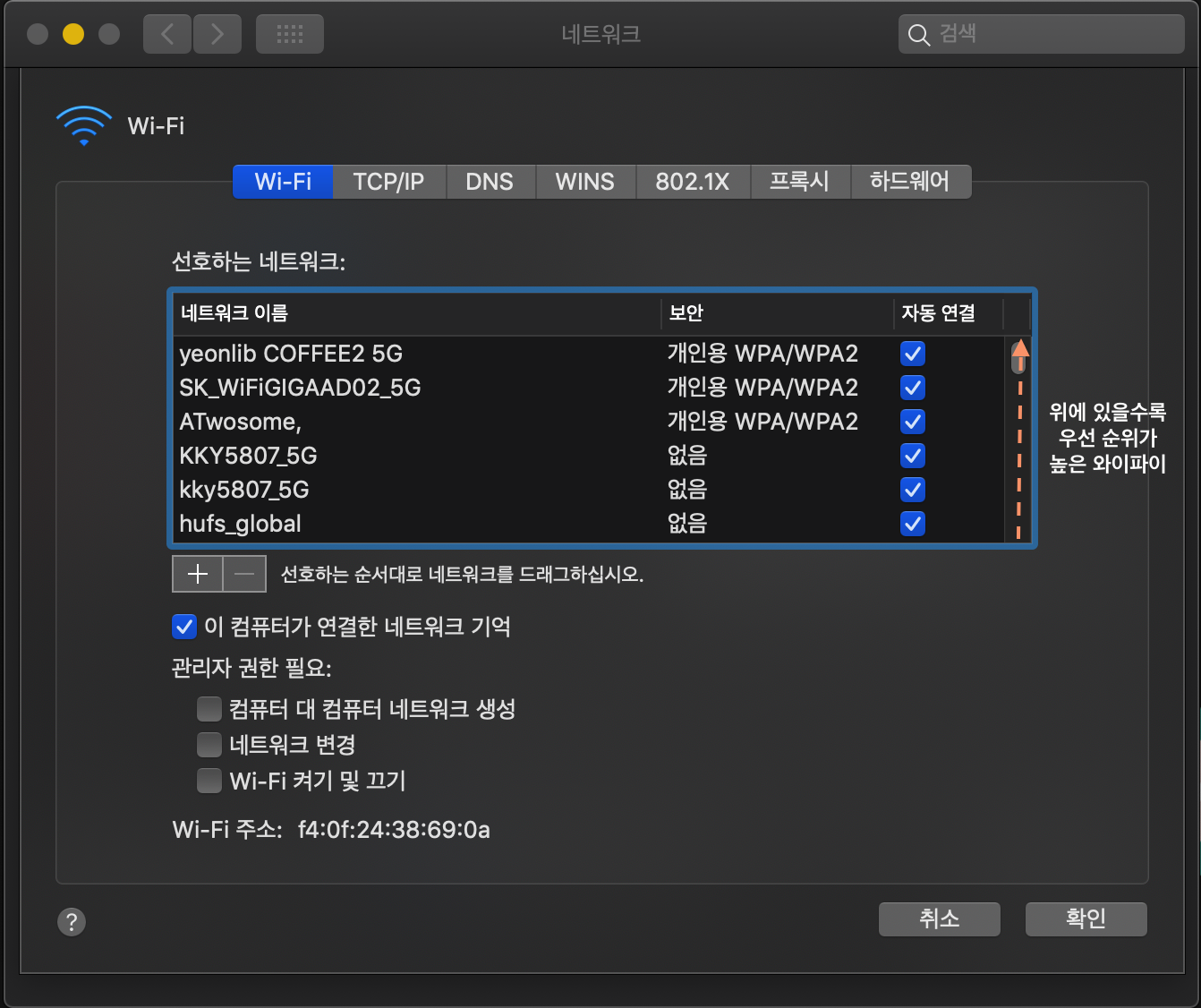 어떤 와이파이에 경우 나중에 연결할 일이 생길 수도 있습니다. 그러한 경우에 삭제하지는 않지만 더 먼저 연결되었으면 좋겠는 와이파이에 우선순위를 부여하여 가능하면 맥이 해당 와이파이에 접속하게 할 수 있습니다.